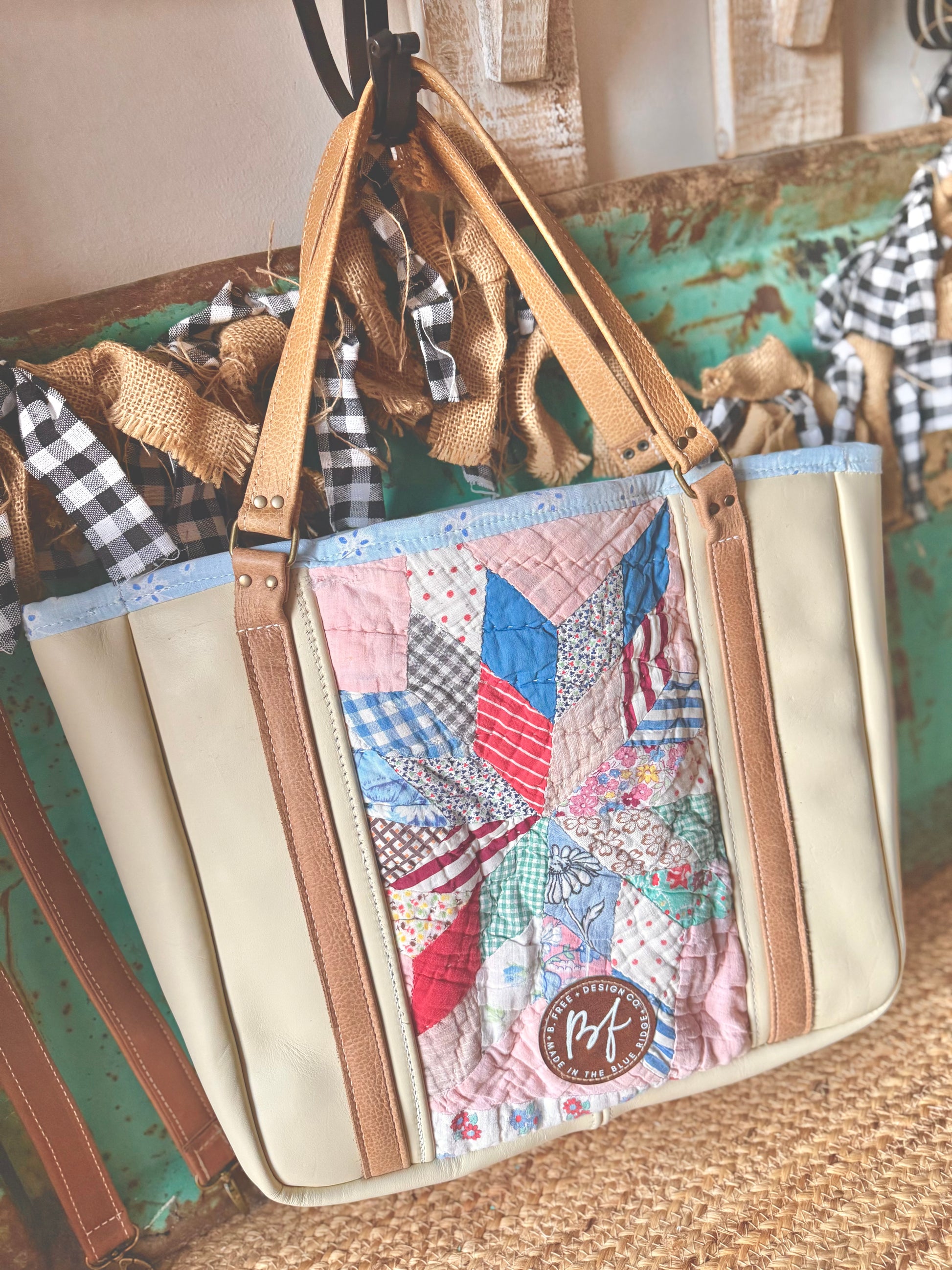 The Gracie Tote is an exclusive limited-edition design from B. Free Design Co., crafted from genuine leather with a striking vintage quilt block accent. Premium leather details the body, handles, and back pocket for durability and timeless style. Fully lined interior with a slip pocket keeps essentials organized. Spacious enough for daily essentials yet refined enough for any occasion—the ultimate grab-and-go companion.
