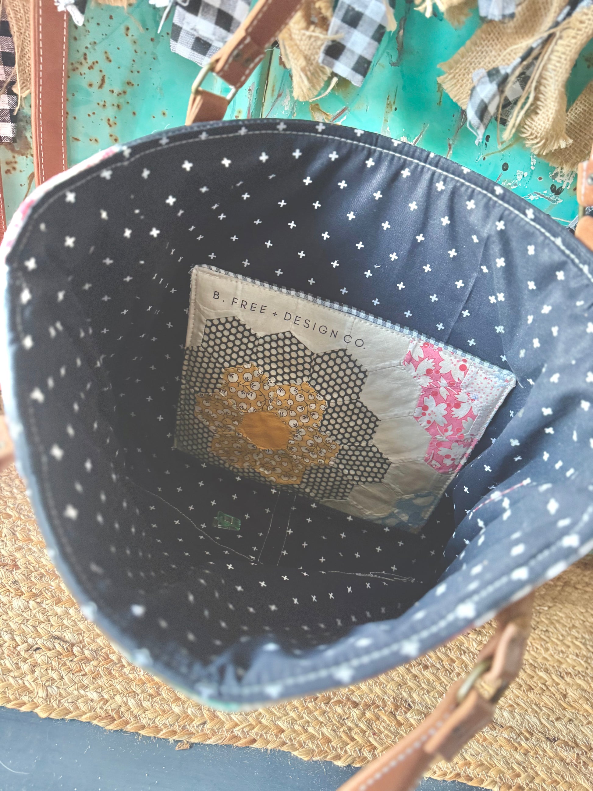 The Gracie Tote is an exclusive limited-edition design from B. Free Design Co., crafted from a vintage grandmothers garden quilt and bright gingham fabric. Premium genuine leather details the handles, and back pocket for durability and timeless style. Fully lined interior with a slip pocket keeps essentials organized. Spacious enough for daily essentials yet refined enough for any occasion—the ultimate grab-and-go companion.