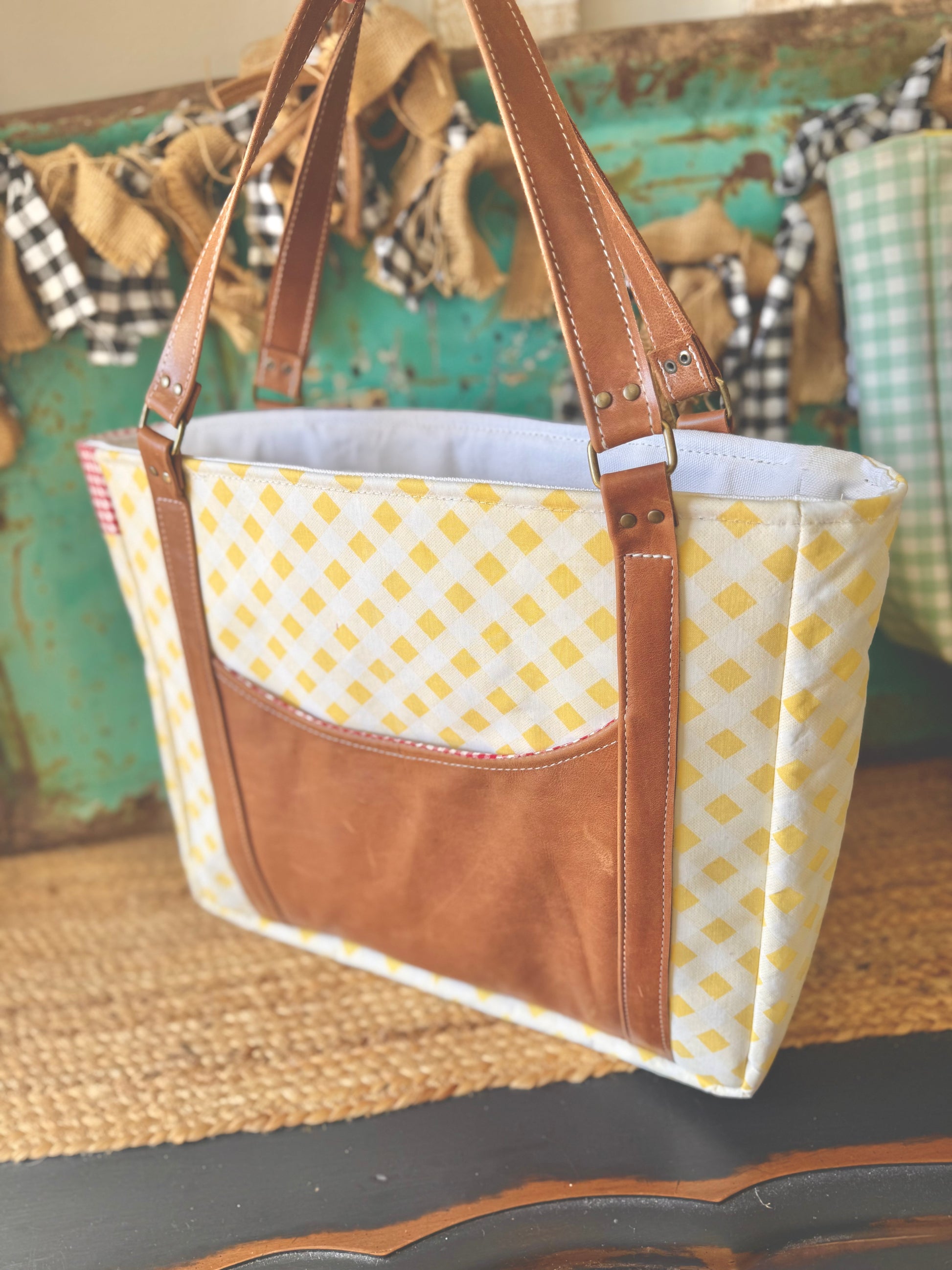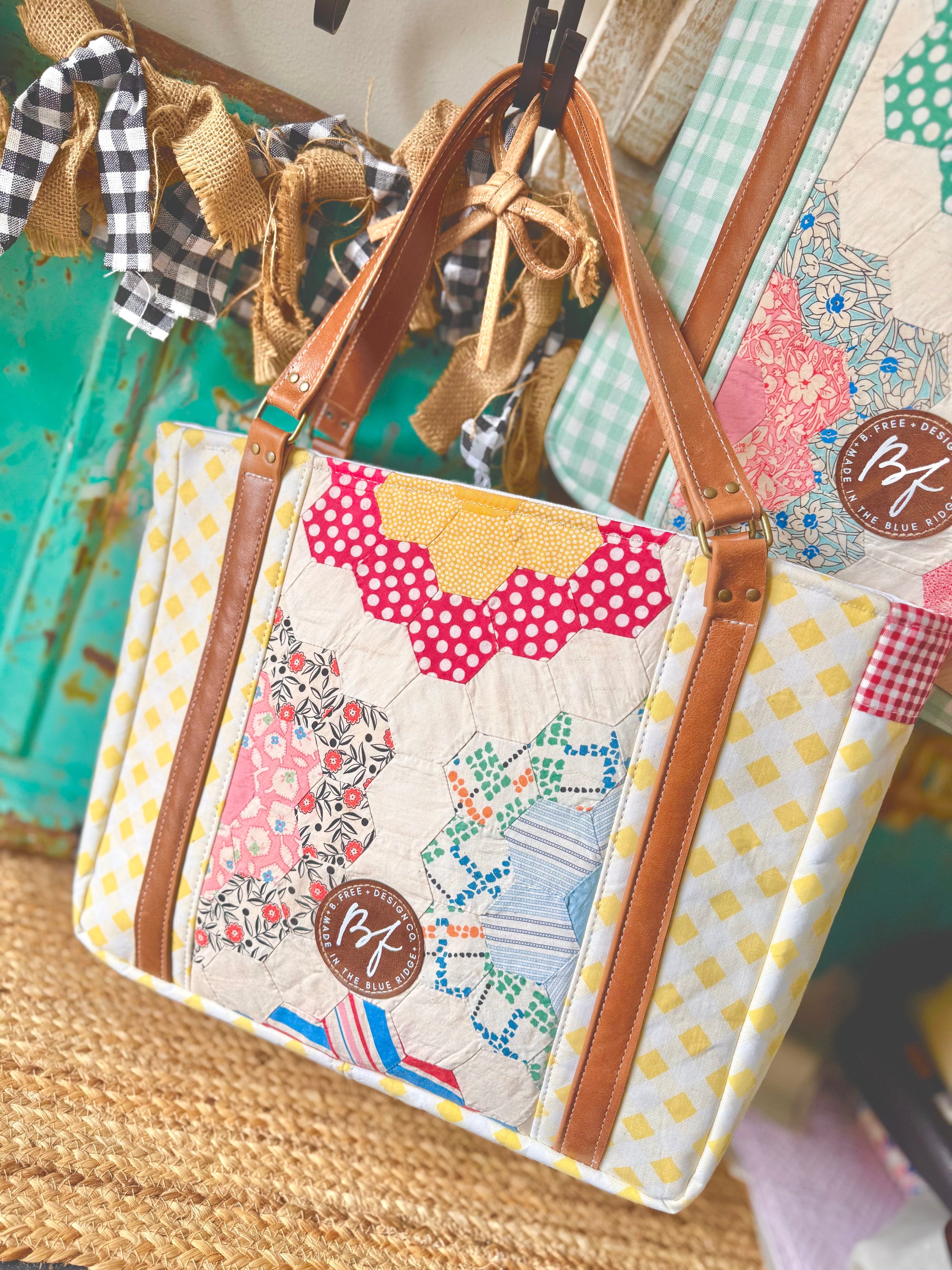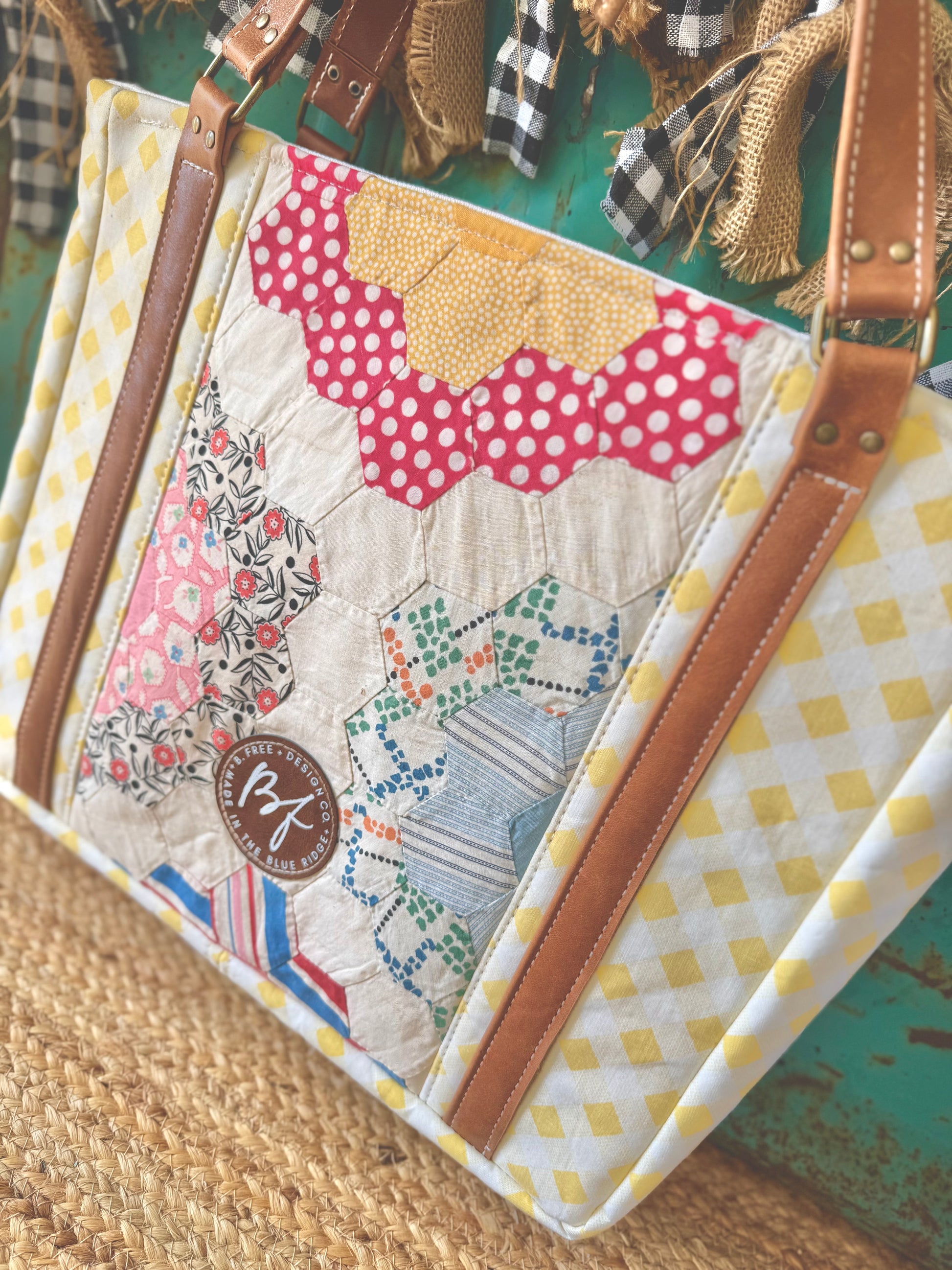 The Gracie Tote is an exclusive limited-edition design from B. Free Design Co., crafted from a vintage grandmothers garden quilt and bright gingham fabric. Premium genuine leather details the handles, and back pocket for durability and timeless style. Fully lined interior with a slip pocket keeps essentials organized. Spacious enough for daily essentials yet refined enough for any occasion—the ultimate grab-and-go companion.